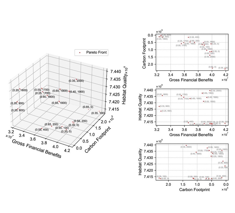 - Pareto analysis identifies 18 optimal policy combinations that balance carbon footprint, habitat quality, and financial benefits.