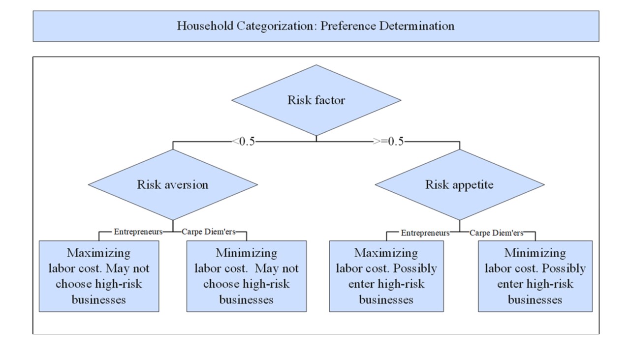 For G2G programs, the study incorporates a risk factor to simulate the uncertainty of business returns and classifies households into distinct categories based on their risk tolerance and preferences for the income-leisure trade-off, which directly influences their decision to participate in G2G initiatives.
