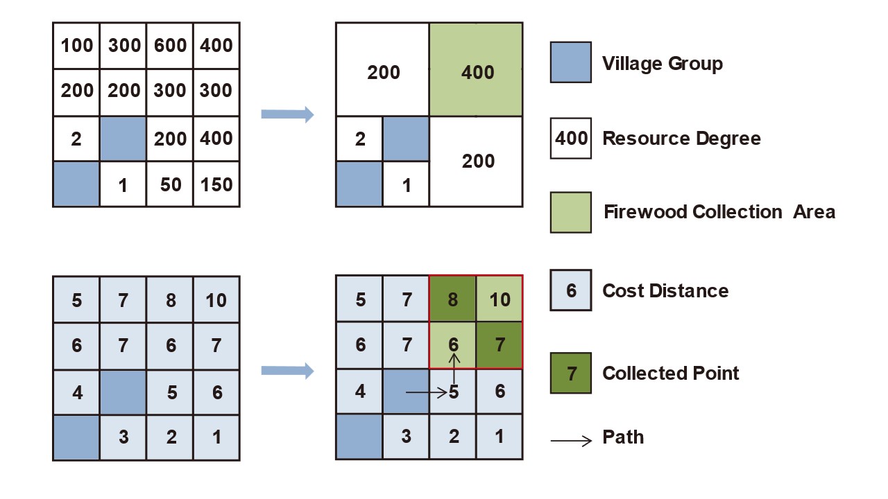 We utilized pathfinding and random walk algorithms to simulate household firewood collection behavior, reflecting real-world practices. This enables a better understanding of how the F2E policy, after influencing household energy use patterns, affects the spatial extent and intensity of firewood collection activities, and consequently, the quality of habitats.